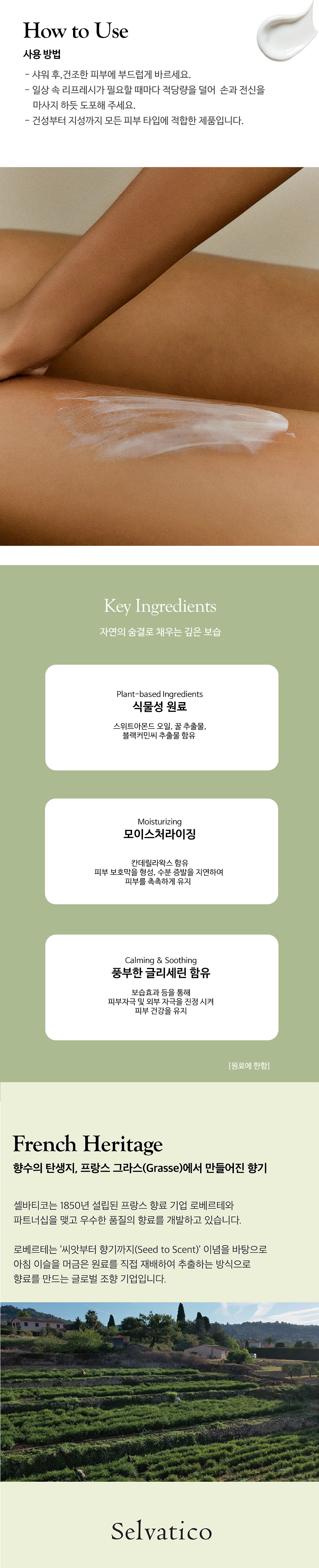 포레 드 퐁텐블로 : 정제수,다이카프릴릴에터,글리세린,글리세릴스테아레이트시트레이트,스위트아몬드오일,향료,데실올리에이트,세테아릴알코올,식물성오일,잔탄검,소듐벤조에이트,아라비아고무나무검,소듐글루코네이트,하이드로제네이티드식물성오일,시트릭애씨드,에틸헥실글리세린,토코페롤,칸데릴라왁스,꿀추출물,스위트아몬드열매추출물,블랙커민씨추출물,포타슘솔베이트,하이드로제네이티드팜글리세라이즈시트레이트,리모넨,헥실신남알,하이드록시시트로넬알,시트로넬올,리날룰,시트랄,제라니올,나무이끼추출물