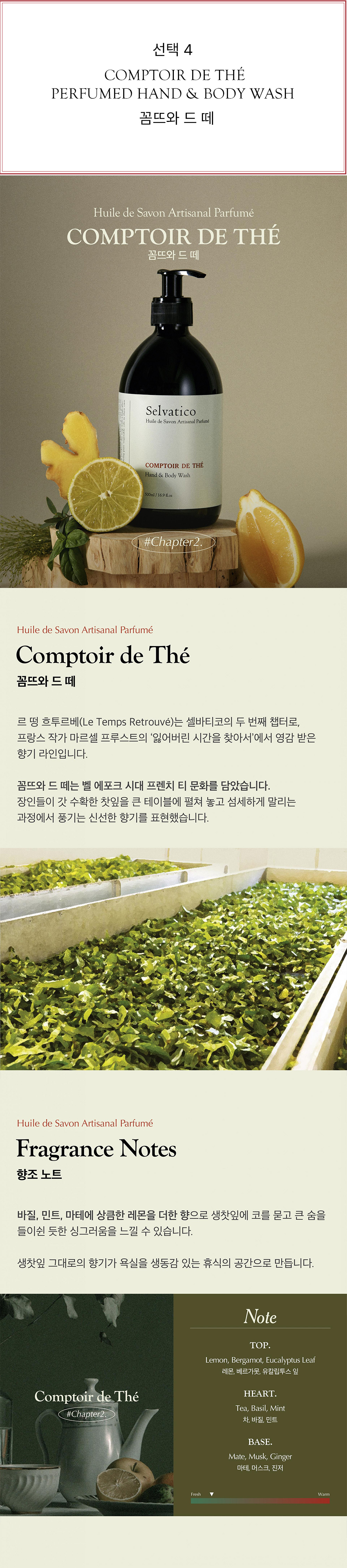 꼼뜨와 드 떼 : 정제수,포타슘코코에이트,향료,폴리글리세릴-3카프릴레이트,글리세린,포타슘올리베이트,하이드록시에틸셀룰로오스,코코넛야자오일,테트라소듐이디티에이,토코페롤,올리브오일,다이소듐포스페이트,폴리솔베이트60,소듐포스페이트,리모넨,리날룰,헥실신남알,유제놀