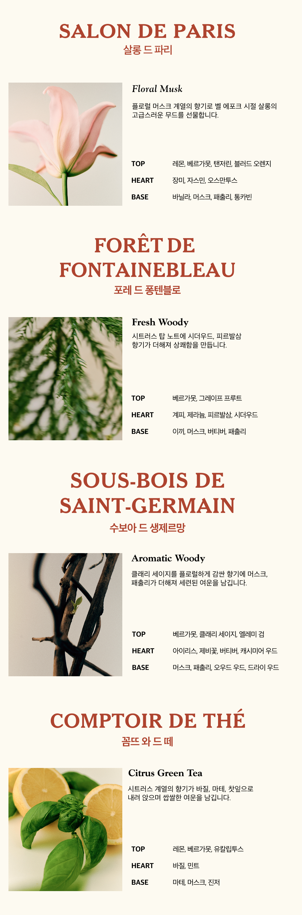 ■포레 드 퐁텐블로:변성알코올,향료,리모넨,헥실신남알,하이드록시시트로넬알,시트로넬올,리날룰,시트랄,제라니올,나무이끼추출물,비에이치티,벤질벤조에이트,토코페롤,아이소유제놀,유제놀, 티비에이치큐,벤질신나메이트,벤질알코올,파네솔,펜타에리스리틸테트라-다이-t-부틸하이드록시하이드로신나메이트,아밀신남알,벤질살리실레이트,신남알