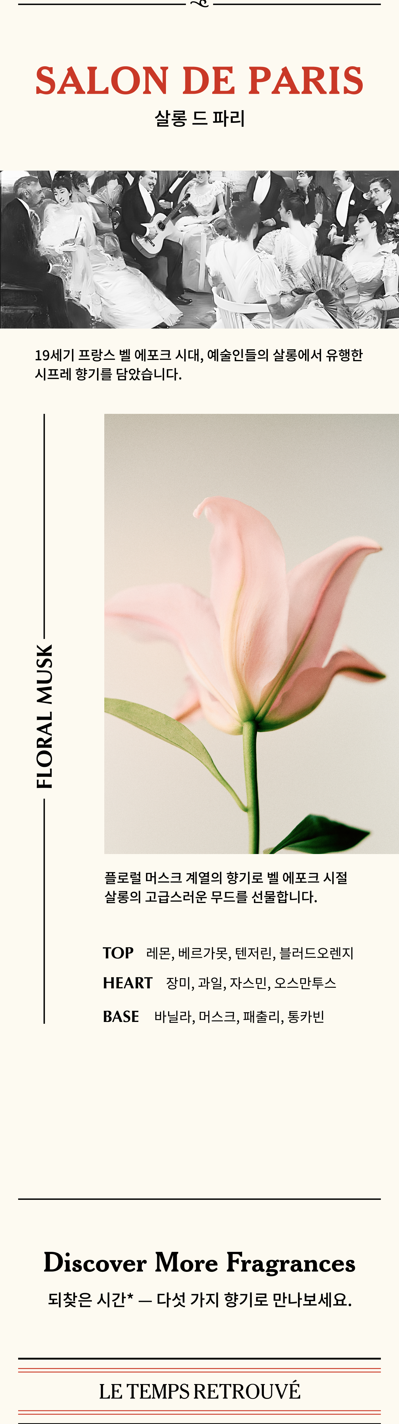 플로럴 머스크 계열의 향기로 벨 에포크 시절 살롱의 고급스러운 무드를 선물합니다.